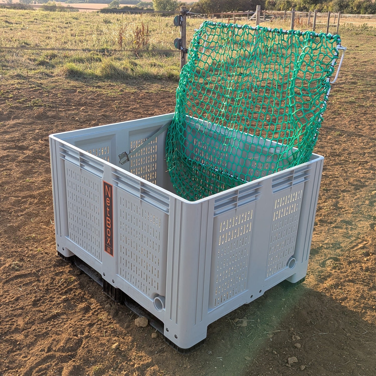 Both versions allow a natural feeding position and the slotted sides and base of the NetBox allow dust, debris and water to fall out, reducing contamination and waste. The NetBox keeps the hay off the floor and is easily moved to clear away debris that collects underneath and to prevent poaching in feeding areas.